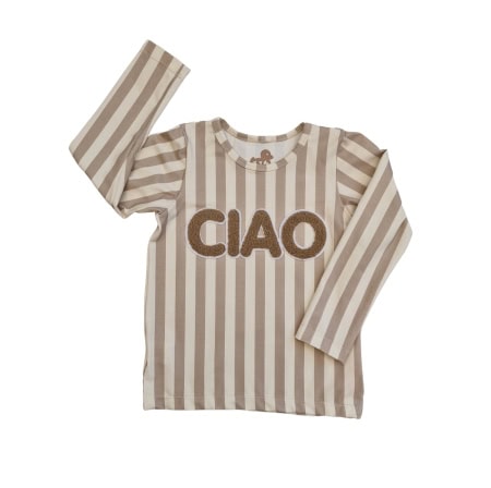 Das ist ein absolutes Hingucker Shirt und durch die schönen natürlichen Creme Töne auch ein gutes Kombi Unikat für viele Untenrums in Minis Kleiderschrank. Das Langarmshirt aus Biojersey hat einen modernen Chenille Patch `CIAO` als Highlight. Der eingefasste Halsausschnitt macht das Shirt ein wenig schicker.